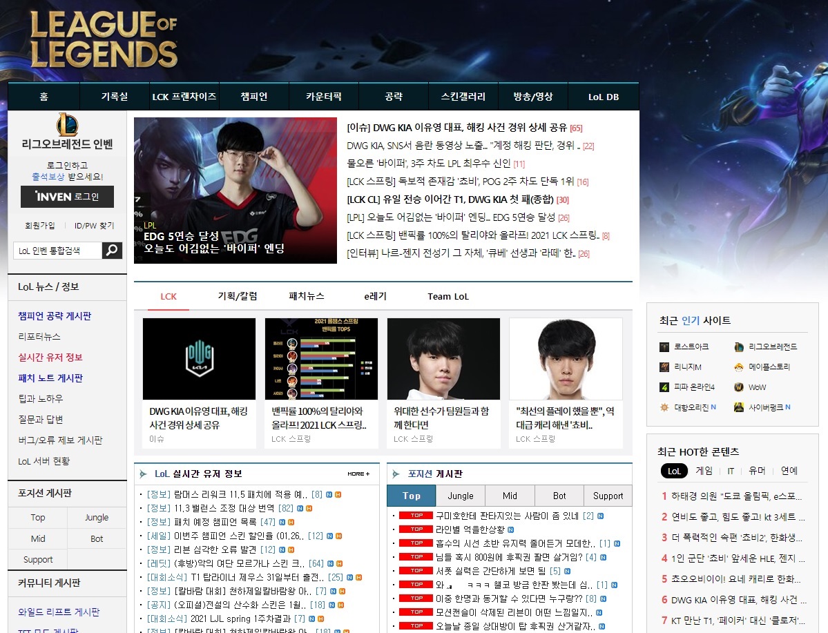 국내 최대 규모를 자랑하는 리그 오브 레전드 커뮤니티 사이트입니다. 실시간 유저 정보, 챔피언에 대한 템트리 등의 공략, 대회 정보, 각 포지션 게시판과 같이 다양한 정보를 얻을 수 있습니다. 사람이 정말 많은 사이트다 보니, 소통도 원활히 할 수 있으며 필요한 정보를 바로 습득할 수 있습니다. 모르는 것이 있다면 리그 오브 레전드 인벤 사이트에서 물어보고 커뮤니케이션하면 됩니다.