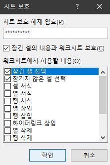 시트를 보호해도 모든 셀은 선택할 수 있다는 의미로, 체크되어 있지 않은 옵션은 허용되지 않는다는 뜻입니다. 그래서 필요한 옵션이 있다면 확인란에 체크하고 시트를 보호합니다. 보호된 시트에서도 설정을 변경할 수 있습니다.