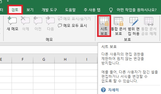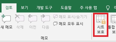 1. 보호하고 싶은 시트에서 리본 메뉴의 [검토] 탭의 [보호] 그룹에 있는 [시트 보호]를 클릭합니다.
