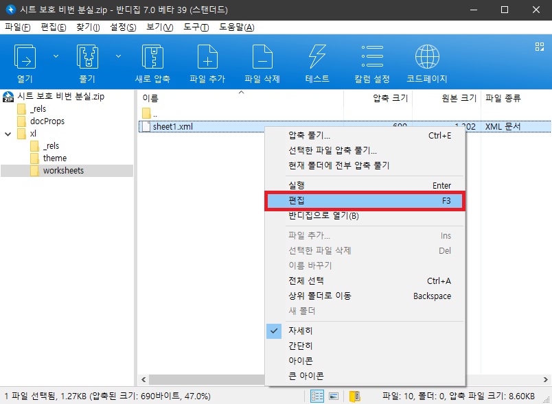 4. 압축된 파일을 더블클릭하여 [xl] - [worksheets] 폴더로 이동한 후 [sheet1] 파일을 마우스 우클릭하여 [편집]을 클릭합니다.