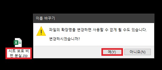 3. 파일을 선택한 채로 F2 키를 눌러 파일 이름 뒤에 '.zip'을 입력하고 엔터를 눌러 이름을 변경합니다. 그러면 아래의 이미지와 같이 이름 바꾸기(확장자 변경) 경고 메시지가 표시되는데, 예를 클릭합니다.