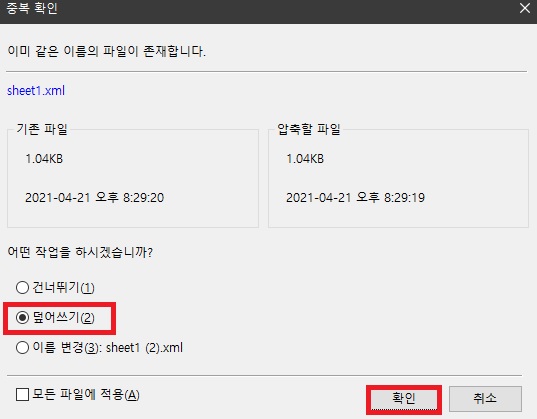 9. [파일 추가] 대화 상자가 나타나면 [추가]를 선택하여 방금 바탕화면에 저장했던 'sheet1.xml' 파일을 추가하여 덮어 씌웁니다.