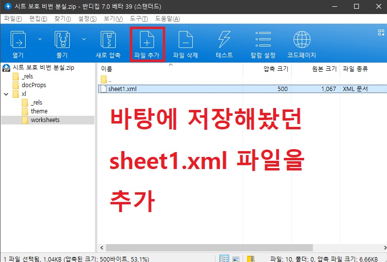 8. 다시 압축된 엑셀 파일을 실행시켜 아까와 같은 장소 [xl] - [worksheets]에 들어와서 [파일 추가] 버튼을 클릭합니다.