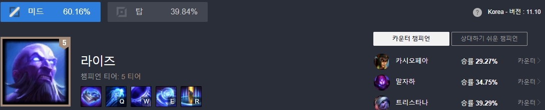 누누는 주로 미드에서 활약을 하지만 가끔 탑에서 사용하는 유저도 있습니다. 강력한 마력으로 적들을 제압할 수 있는 능력을 가진 라이즈는 5 티어에 위치해 있네요. 카운터 챔피언으로는 카시오페아 말자하, 트리스타나 등이 있으며 라이즈가 상대하기 쉬운 챔피언으로는 베이가, 오리아나, 제이스 등이 있습니다. 라이즈는 순간 이동할 수 있는 궁극기 말고는 회피기나 도주기가 없는 '뚜벅이' 챔피언 이기 때문에 지나치게 아군의 의존도와 난이도 자체가 높아서 솔랭에서는 자주 사용하지 않는 챔피언이기도 합니다.