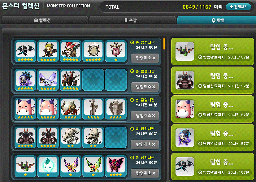 7. 몬스터 컬렉션 보상 획득하기 : 사냥을 하다 보면 일정 확률로 몬스터가 몬스터 컬렉션에 등록됩니다. 컬렉션에 등록된 몬스터 세트가 충족되면 보상을 받을 수 있으며 '탐험' 탭을 통해 꾸준하게 탐험 상자를 획득할 수 있습니다. 소소한, 적당한, 괜찮은, 상당한 등의 다양한 탐험상자에서 명성치를 얻어낼 수 있습니다.