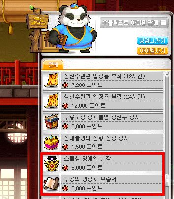 1. 무릉도장 격파하기 : 무릉도장을 격파하면 일정 조건 충족 시 무릉포인트를 지급받게 되는데, 무릉 포인트를 모아 '스페셜 명예의 훈장'을 구매하면 1만의 명성치를 획득할 수 있습니다. 고스펙 캐릭터를 육성하고 있는 사람이라면 매주 빼놓지 않고 돌아주는 콘텐츠이기도 합니다. 이외에도 '무공의 명성치 보증서'를 구매하여 교환 가능한 명예의 훈장으로 바꿔 경매장에 판매 후 메소를 얻을 수도 있으며, 반대로 경매장에서 '무공이 보증한 명예의 훈장'을 구매하여 바로 명성치를 적립할 수 있습니다.