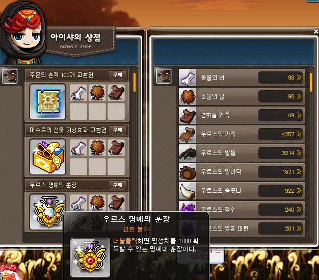 4. 아이샤의 상점(우르스 콘텐츠) 이용하기 : 우르스 콘텐츠를 즐기려면 100 레벨 이상이 되어야 합니다. 선행 퀘스트는 거의 없다시피 아주 짧기 때문에 금방 끝낼 수 있습니다. 우르스 입장 가능 횟수는 하루 3회이며, 격파 시 아이샤의 상점 재료 아이템과 메소(13시부터 23시까지 2배)까지 획득할 수 있으므로 꼭 하루마다 해줘야 하는 콘텐츠입니다. 여기서 우르스 재료 아이템을 이용하여 아이샤의 상점에 들어가 '우르스 명예의 훈장'을 구매하면 명성치를 획득할 수 있습니다. 우르스 명예의 훈장 재료 아이템은 다음과 같습니다.